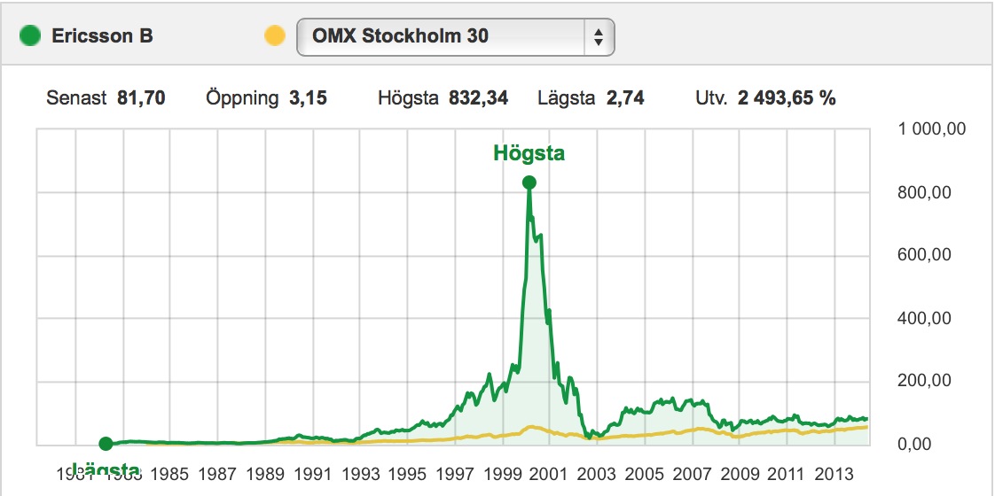 Det anrika bolaget Ericsson som verkat på marknaden sedan 1876 har haft en riktig framgångssaga inom telekommunikation. Så sent som 2012 hade de 38% av marknaden för att bygga nätverk för mobil kommunikation. Men under IT- och telekomkrisen hände något drastiskt med bolaget. År 2000 ett rekordår för Ericssons omsättning med 273 miljarder kronor och detta var 58 miljarder mer än 1999. Detta resulterade i en nettovinst på hela 21 miljarder kronor, fantastiskt! Aktien steg till rekordnivån 892 kronor den 28 februari 2000.