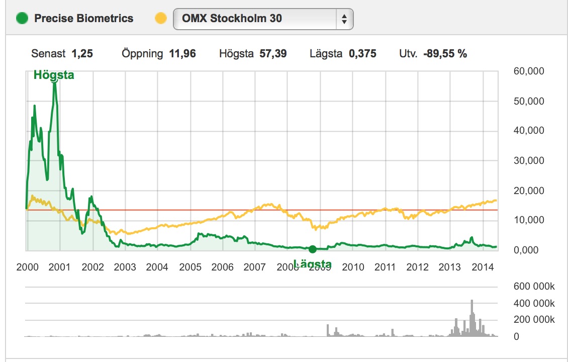 Jag har tittar närmare på tre bolag som fanns med under Millenumskiftet och där två av bolagen inte levererar några vinster och historien visar på samma trend. Det tredje bolaget Proacts historia är inte heller så ljus men under ett antal år har man visat på vinst och är en ledande aktör inom segmentet molntjänster. Bolaget Fingerprint Cards som är noterad på midcap omsätter runt 90 miljoner men utlovar siffran 500 miljoner under 2014. Bolaget går inte med vinst men de har expanderat kraftigt under det senaste året. Deras historiska graf ser ut enligt följande: