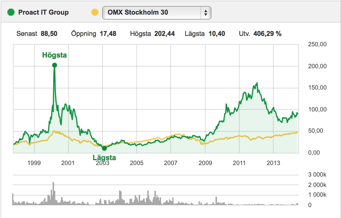 Proact är det av bolagen som haft en mer verklighetsanpassad verksamhet under de senaste tio åren. Med en kurspeak på 202 kronor den 13:e mars 2000 föll den drastiskt ner till dryga 10 kronor två år senare. Nu agerar bolaget i Europa och har en vinstdrivande verksamhet med utdelning till aktieägarna.