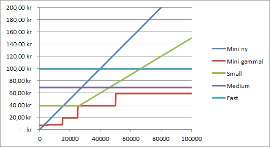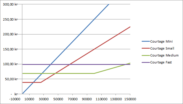 Men vad blir billigast nu då? Vilken courtageklass ska man välja? Det beror ju givetvis på vilken storlek din order brukar ha. Det finns vissa brytpunkter och dessa kan man lätt se i detta diagram:
