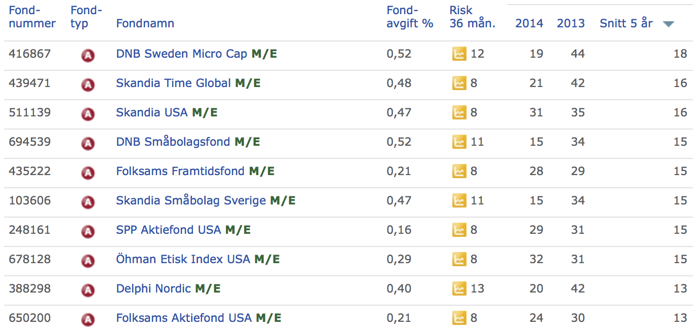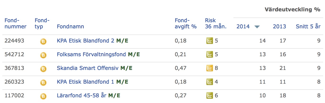 Det finns för närvarande 121 etiska fonder som man kan välja mellan för sin premiepension. Om man ser till hela PPM utbudet finns det 856 valbara fonder. Det är intressant att se vad de innehåller och hur en framgångsrik etisk fond väljer bolag. Det är lätt att ha en föreställning om vad man ska finna i innehavet som t.ex vindkraft och solenergi. Men här misstar man sig och blir snart varse att fondbolagen har en helt annan syn på vad som är etisk eller snarare vad de väljer bort. Vi tar tar ut de fem fonder som har gått bäst under 2014. Vi väljer att se vilken avkastning de fått hittills under 2014 som jämförelse. Texten är i stort tagen från Avanzas beskrivning av fonderna och PPM numret står inom parentesen tillsammans med fondavgiften.