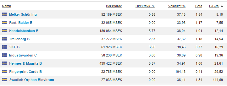 - p/e: 495,14 för SOBI (Swedish Oprhan Biovitrum)