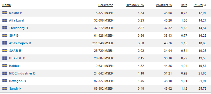 Men en liten demonstration av aktievärdering med hjälp av p/e-tal kan ju vara intressant. Det talas mycket om verkstad/industri nu. En bransch som tagit mycket stryk tidigare. Vad ser vi om vi jämför olika bolag med p/talet och direktavkastningen? (Jag brukar titta på direktavkastning för att på något sätt se på hur bolaget själva ser till sitt behov att använda sin vinst. Lite trubbigt då en del delar ut lite mer än vad som är riktigt bra…)