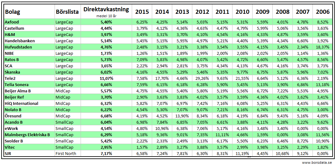 Man kan alltså med hjälp av P/E-talet och direktavkastningen börja sortera lite bland bolagen. Men allt beror på vad vi tror att bolagen kommer att göra för vinster i framtiden. Stiger vinsterna kraftigt så blir p/e-talet automatiskt lägre.