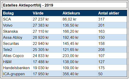 Hur ser då själva portföljen ut? Jo… det är dags att jobba lite med portföljen. Avknoppningarna Epiroc och MTG säljs av, och allt kapital används för att fylla på extra i Handelsbanken och Atlas Copco som annars utgör en lite för liten del av portföljen. Sedan byts Kinnevik ut mot det stabila bolaget SCA. De stora innehaven i svensk skogsareal borgar för en jämn utveckling framöver. Skogen växer oavsett hur det går för konjunkturen i övrigt. Det medför att portföljen ser ut enligt följande: