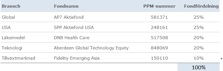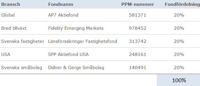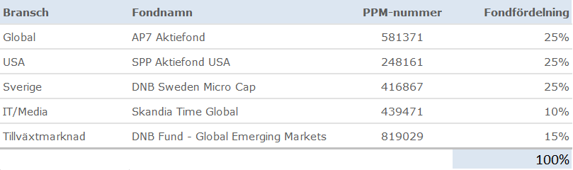 En jämn fördelning som försöker fånga upp allt. En bra globalfond, en branschfond som utvecklats oerhört bra under lång tid, en billig USA-fond och en bra Sverigefond. Alla fonderna har väldigt bra historik, och vi hoppas på en lika bra framtid!