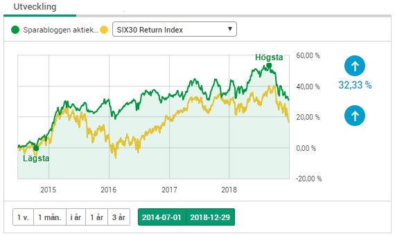 Även 2018 har varit ett ganska volatilt år. I stort sett åksjuka av bergochdalbanan. Sparabloggen har inte riktigt hängt med i svängarna, utan legat strax under index med utdelningar. Det är första året som vi inte lyckats göra vinst. En nedgång på 2,04% är inte jätteilla, men absolut inte bra. Vi landade i par med index till slut.