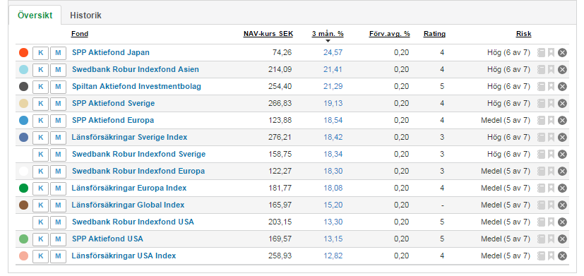Titta på din bank eller försäkringsbolags utbud och leta efter indexfonder som ligger runt 0,20%, mer ska du inte behöva betala. Sprid dina risker och investera i olika delar av världen. En bra bas just nu är USA, Sverige, Global, Europa och Asien.