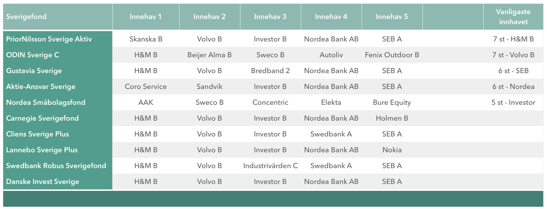 Om man tittar vad Svenska aktiefonder har för största innehav är det föga förvånande att att se H&M och Investor som basinnehav bland fondförvaltarna vilket väl överstämmer med vad DI:s Börsakademi hade dragit för slutsats.